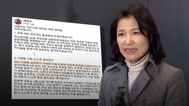 이 전 위원장은 오늘 SNS를 통해 자신의 컷오프 당시 공관위에서 '더 큰 역할'을 해주길 바란다고 한 문구에 대해 "국회의원이 되는 것이 '더 큰 일'이라면 왜 대구지역 국회의원 12명 가운데 다섯 명씩이나 '더 작은 일'을 하러 시장직에 출마한 것"이냐고 지적했습니다.