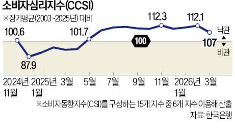 그러다 보니 소비자들의 경제 심리도 뚜렷하게 얼어붙었다. 한국은행이 지난달 25일 발표한 ‘소비자동향조사’ 결과에 따르면 3월 소비자심리지수(CCSI)는 107.0으로 1월(112.1)보다 5.1포인트(P) 떨어졌다. 비상계엄 사태 당시였던 2024년 12월(-12.7P) 이후 1년 3개월 만에 가장 큰 하락 폭이다.