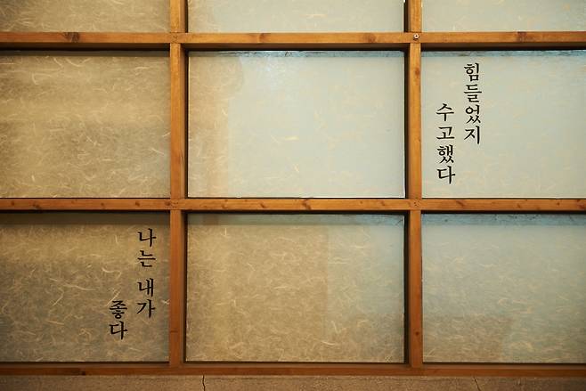 | ▲ 3월 26일 오후 서울 신사동 카페 당옥에서 신동민 셰프를 만났다. 그의 매장 벽에 있는 문구들. |