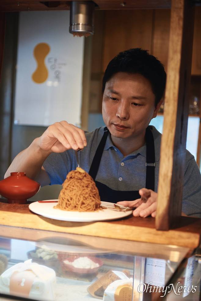 | ▲ 신동민 셰프가 직접 밤타래 치즈 케이크를 만들고 있다. |
