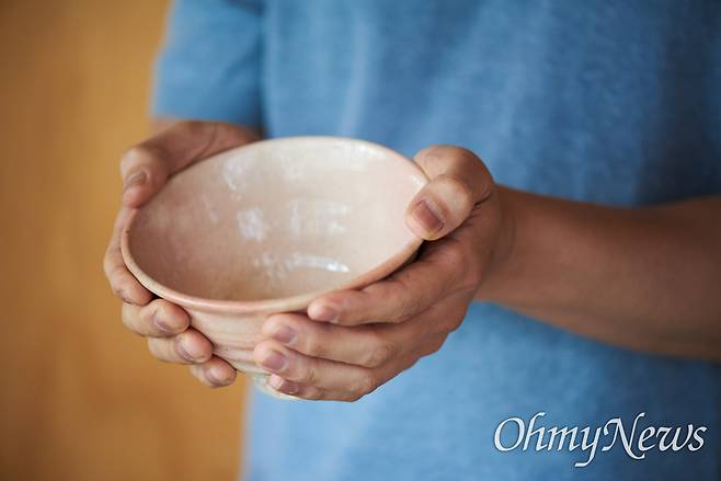 | ▲ 국가무형유산 백산 김정옥 선생을 오랜 시간 설득해 협업하게 된 신동민 셰프는 "다완잔으로 종종 잔멍을 때린다"며 웃어 보였다. 잔을 바라보고 있으면 마음이 편해진다는 이유다. |