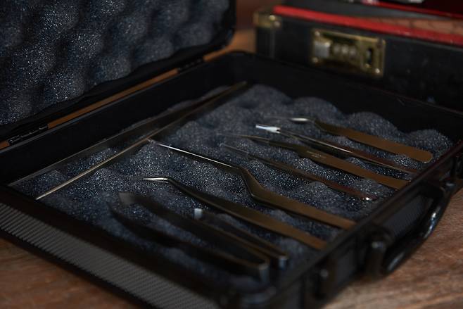 | ▲ 신동민 셰프가 일본의 한 제조회사와 협력해 개발한 핀셋 세트. 본인이 가장 좋아하는 조리도구로 칼과 핀셋, 그리고 다완을 꼽기도 했다. |
