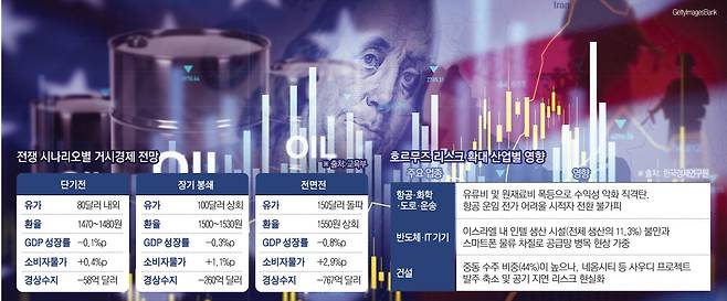 거시지표도 동시에 흔들린다. 전쟁이 장기화될 경우 3단계 전면전 국면에서는 한국의 국내총생산(GDP) 성장률이 0.8%포인트(p) 하락하고 소비자물가는 2.9%p 상승할 것으로 전망된다. 경상수지 감소폭도 767억달러(약 116조원)에 달할 것으로 예상된다. 성장 둔화와 물가 상승이 동시에 나타나는 전형적인 스태그플레이션 구조다.