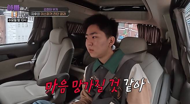 이날 김정태 아내는 "(지후가) 고등학교에 가야 되는데 예전부터 기숙사 있는 곳을 가고 싶다고 해서 이번에 진단을 받아보러 왔다"고 말했다. 그러나 지후는 병원에 가서 박사님에게 진단받는다는 말에 "박사님한테 들으면 마음이 망가질 것 같다"며 긴장한 모습을 보였다.