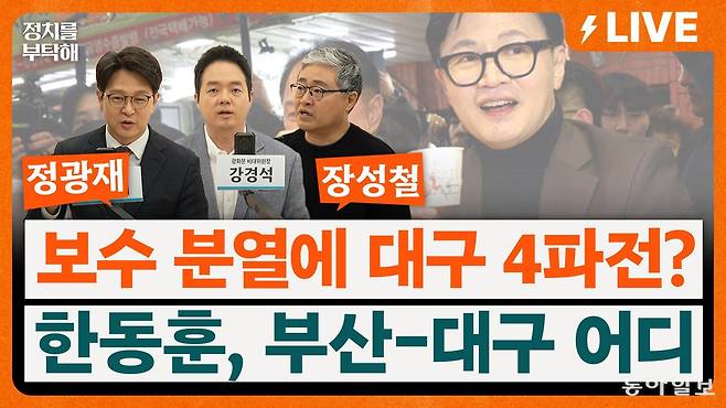 ▷강경석: 자 그런데 사실 한동훈 전 대표 같은 경우는 지금 뭐 국회의원 당선 당선이 목적이 아니라, 결과적으로는 뭐 당권과 대권 쭉 이어지는 상황인데 만약에 대구가 아니라 부산을 택한다. 장 위원이 보실 때 혹시 부산을 택한다면 그 이유는 뭐라고 보세요?