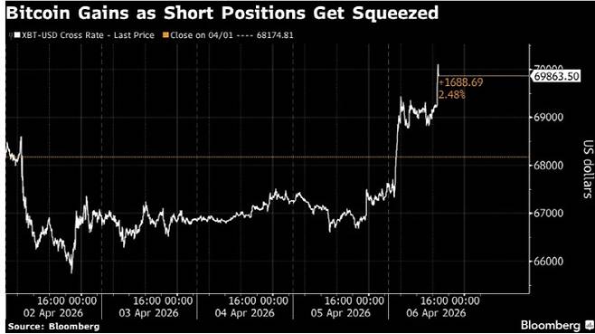 이란 휴전 모색에 매도포지션 대거 청산…비트코인 2주만에 7만달러 회복