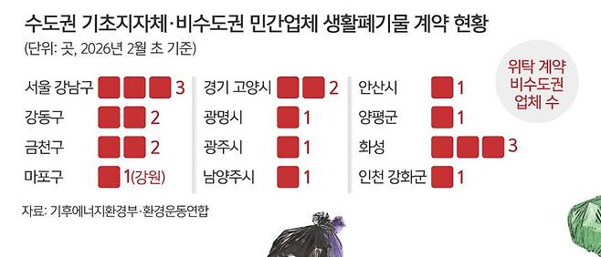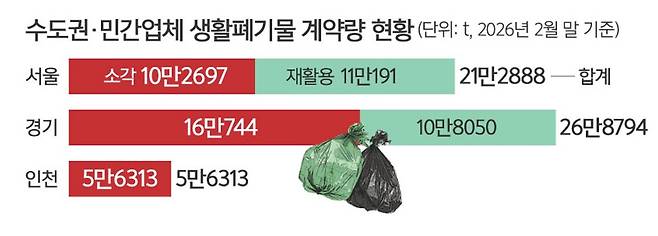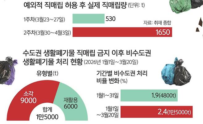 이 기간 수도권에서 발생한 생활폐기물 중 2.4%(1만5000t)가 비수도권에서 처리된 것이다. 기후부는 2월 초 직매립 금지 안정적 이행 방안을 발표하면서 1월 한 달간 비수도권 위탁 처리량 비율이 1.9%(4800t)라고 밝혔다. 직매립 금지 시행 후 불과 50일 만에 비수도권 처리 비중이 가파르진 않지만 꾸준한 상승곡선을 그리게 된 것이다.