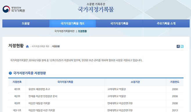 그러나 이날 국가지정기록물 홈페이지를 보면 2015년 지정된 12호(3·1운동 관련 독립선언서류)를 마지막으로 그 이후 지정된 기록물에 대한 정보는 찾아볼 수 없다.