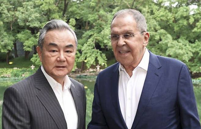신화통신은 지난 5일 왕이 중국공산당 외사판공실 주임 겸 외교부장(왼쪽 사진)과 세르게이 라브로프 러시아 외교장관(오른쪽)이 러시아 측의 요청으로 전화 통화를 하고 중동 정세에 대한 의견을 교환했다고 6일 보도했다. 두 장관 간 통화는 도널드 트럼프 미 대통령이 ‘합의에 응하지 않으면 모든 것을 날려버리겠다’고 이란을 위협한 날 이뤄졌다.