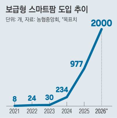 6일 농협중앙회에 따르면 현재까지 전국에 설치된 보급형 스마트팜 수는 1273개다. 2021년 8곳에서 시작해 2024년 234곳, 지난해 977곳으로 늘었다. 강호동 농협중앙회장이 지난해부터 적극 스마트팜 확대를 강조한 데 이어 농민들 사이에서 입소문을 타면서 확산되는 추세다.