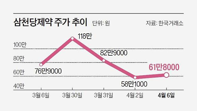 6일 삼천당제약의 정규장 종가는 61만8000원으로 고점 대비 절반 수준을 기록했다. 애프터마켓에선 종가대비 10% 넘게 급락한 54만5000원에 마감했다.