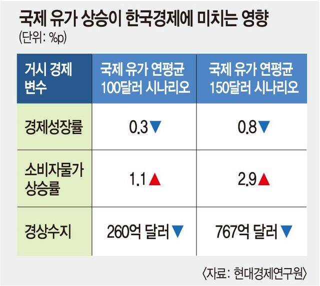 만약 호르무즈 봉쇄가 더욱 장기화돼 국제 유가가 배럴당 150달러 이상 상승하면 경제성장률은 최소 0.8% 포인트 하락, 소비자물가는 2.9% 포인트 상승, 경상수지는 767억 달러 감소한다는 게 연구진의 분석이다. 이는 올해 경제성장률이 지난해(1.0%) 수준에 그칠 것이라는 의미다.