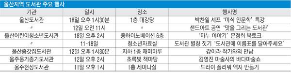 도서관의 날(4월12일)과 도서관 주간(4월12~18일)을 맞아 울산지역 도서관에서도 도서관별로 주제를 정해 특강을 비롯해 북 토크, 공연 및 영화 상영, 체험 프로그램, 원화 전시, 북 큐레이션, 참여형 이벤트 등 다채로운 행사가 펼쳐진다.