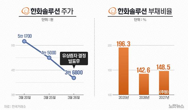 한화솔루션이 초대형 유상증자를 결정한 뒤 시장의 반발이 이어지자 대주주 초과 청약 등 진화에 나섰지만 후폭풍이 가라앉지 않고 있다. 사측은 미래 성장을 위한 선제적 투자라는 설명이지만, 증권가에서는 부채 부담을 투자자에게 분담시킨다는 반응이다.