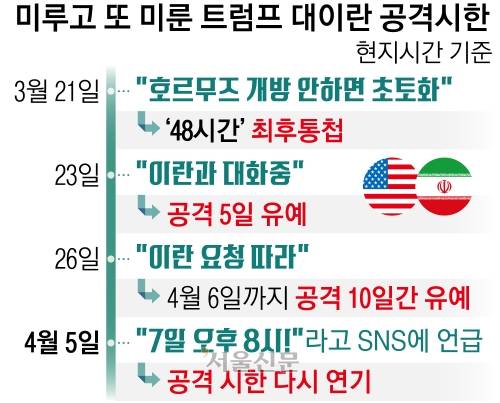 트럼프 대통령은 이날 트루스소셜에 아무런 설명 없이 ‘미 동부시간 기준 7일 오후 8시!’(한국시간 8일 오전 9시)라고 적었다. 이란과의 협상 시한을 앞서 제시한 6일 오후 8시에서 하루 연기한다는 뜻을 밝힌 것으로 풀이된다. 지난달 21일 밝힌 ‘48시간 최후통첩’을 세 차례 연기한 것으로, 구체적인 이유는 밝히지 않았다. 그는 이날 월스트리트저널(WSJ)과의 인터뷰에서 호르무즈 해협을 개방하지 않으면 “발전소와 다리가 하나도 남지 않을 것”이라고 경고했다.