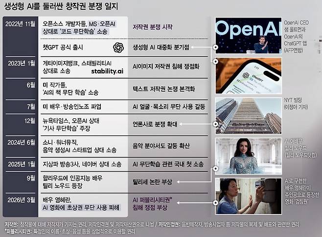 창작자들과 인공지능 기업 간 갈등은 법적 분쟁으로 비화돼 왔다. 2023년 1월, 세계 최대 이미지 콘텐츠업체 게티이미지는 ‘스테이블 디퓨전’을 개발한 영국 스태빌리티 에이아이가 자사 이미지를 허가 없이 대량 학습에 활용했다며 소송을 제기했다. 이후 창작자들의 반발은 글과 음악, 초상권 등 전 분야로 확산됐다.