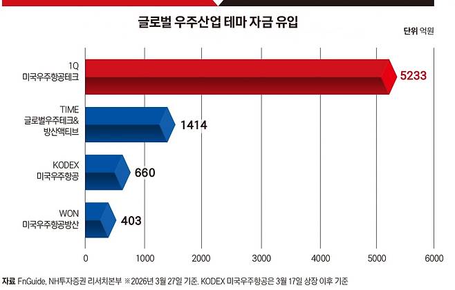 국내 투자자들의 발걸음은 이미 우주로 향하고 있다. NH투자증권에 따르면 연초 이후 글로벌 우주산업 테마 자금 유입액은 ‘1Q 미국우주항공테크’가 5233억원으로 압도적인 1위를 기록했다. 이어 ‘TIME 글로벌우주테크&방산액티브’(1414억원), 상장한 지 보름 남짓 된 ‘KODEX 미국우주항공’(660억원) 등에도 뭉칫돈이 몰리고 있다.