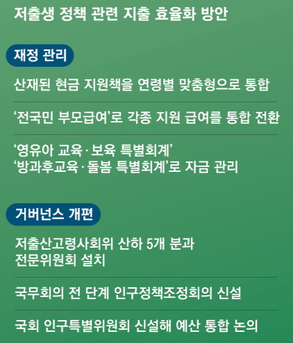 그러면서 아동수당 등 산재돼 있는 현금성 지원을 패키지로 만들어 통합해 운영하는 방안을 내놓았다. 첫만남바우처와 기저귀·조제분유를 ‘영아바우처’로 단일화하고 아이돌봄 서비스와 가정양육수당은 ‘유아바우처’로 합치는 식이다. 또 고용보험 내 출산급여와 일반회계의 고용보험 미적용자 출산급여, 복지부의 부모급여를 통합해 ‘전국민 부모급여’로 전환할 수 있다.