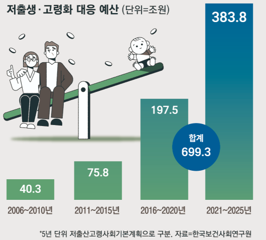 6일 강지원·임준경 보사연 연구원이 최근 발간한 ‘인구정책 대응 재정전략: 저출산 대응을 중심으로’ 보고서에 따르면 2006년부터 4차례 수립된 저출산고령사회 기본계획에 투입된 재정은 총 699조3000억원으로 집계됐다.