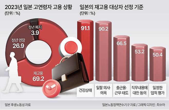 다만, 기업이 고령자를 선별하는 과정에서 실제로 재고용이 되지 않은 근로자는 전체의 2.2%에 그쳤던 것으로 조사됐다. 기업들이 인건비를 크게 줄이기보단, 근로 의욕이 크게 떨어지는 ‘프리라이더’들을 선별하는 데 제도를 활용했다는 의미다. 일본노동정책연수기구에 따르면 일본의 재고용 대상자 선정 기준을 조사한 결과 ▷건강상 지장이 없을 것(91.1%) ▷일할 의사·의욕이 있을 것(90.2%) ▷출근율·근무태도(66.5%) 순으로 합리적인 수준에 그쳤다.