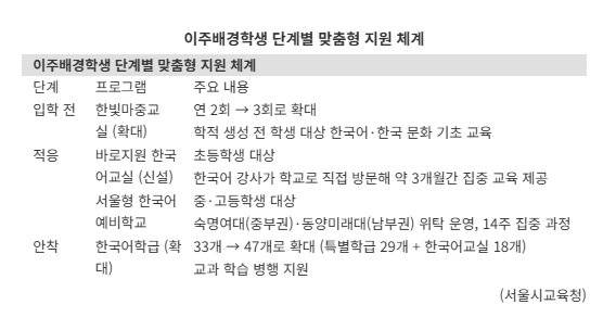 서울시교육청은 이주배경학생들의 공교육 안착을 지원하기 위한 '단계별 맞춤형 한국어교육 지원책'을 본격 확대 추진한다고 7일 밝혔다.