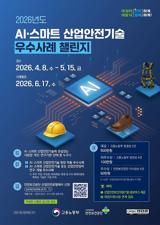 산업현장에서 인공지능(AI)과 스마트 기술을 활용한 재해 예방 사례를 발굴·확산하기 위해 'AI·스마트 산업안전기술 우수사례 챌린지'를 공모한다.