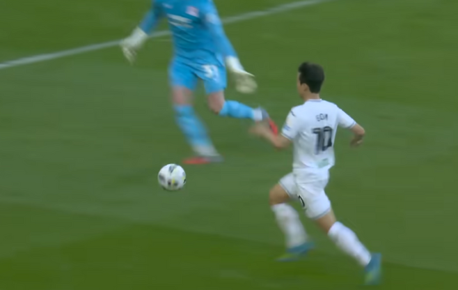 1-1로 맞선 상황, 후방에서 넘어온 침투패스를 받은 엄지성은 상대 골키퍼 솔로몬 브린의 손에 걸려 넘어졌다.