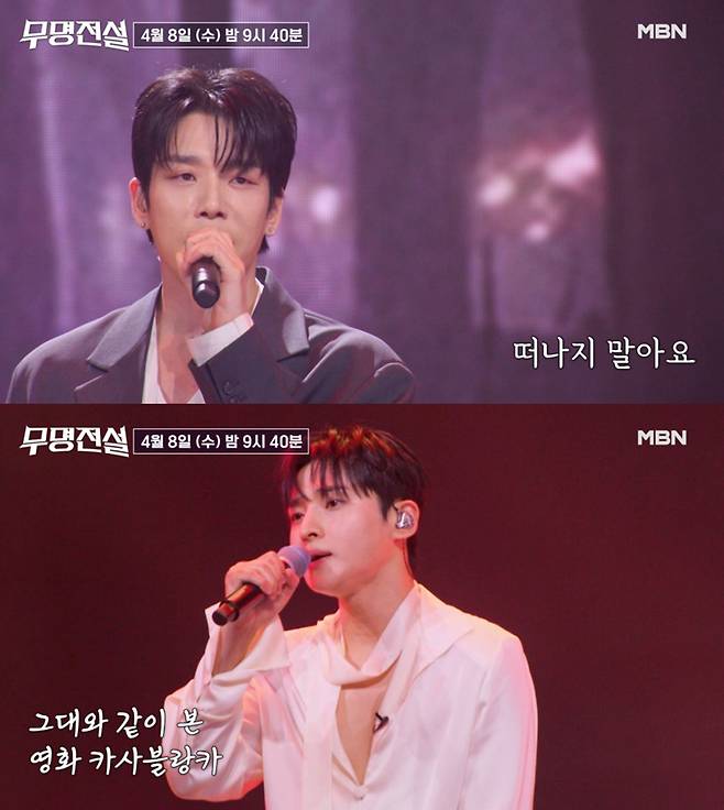MBN 트롯 오디션 ‘무명전설-트롯 사내들의 서열전쟁’(이하 ‘무명전설’)이 측은 지난 6일부터 공식 SNS를 통해 오는 8일 방송될 7회 선공개 영상을 공개했다. 영상에는 19년 차 보컬리스트 이창민과 신흥 강자 성리의 무대 일부가 담기며 뜨거운 관심을 모았다. 아이돌 선후배의 자존심이 걸린 ‘유명 vs 유명’ 빅매치가 성사된 가운데, 치열한 진검승부가 예고됐다.