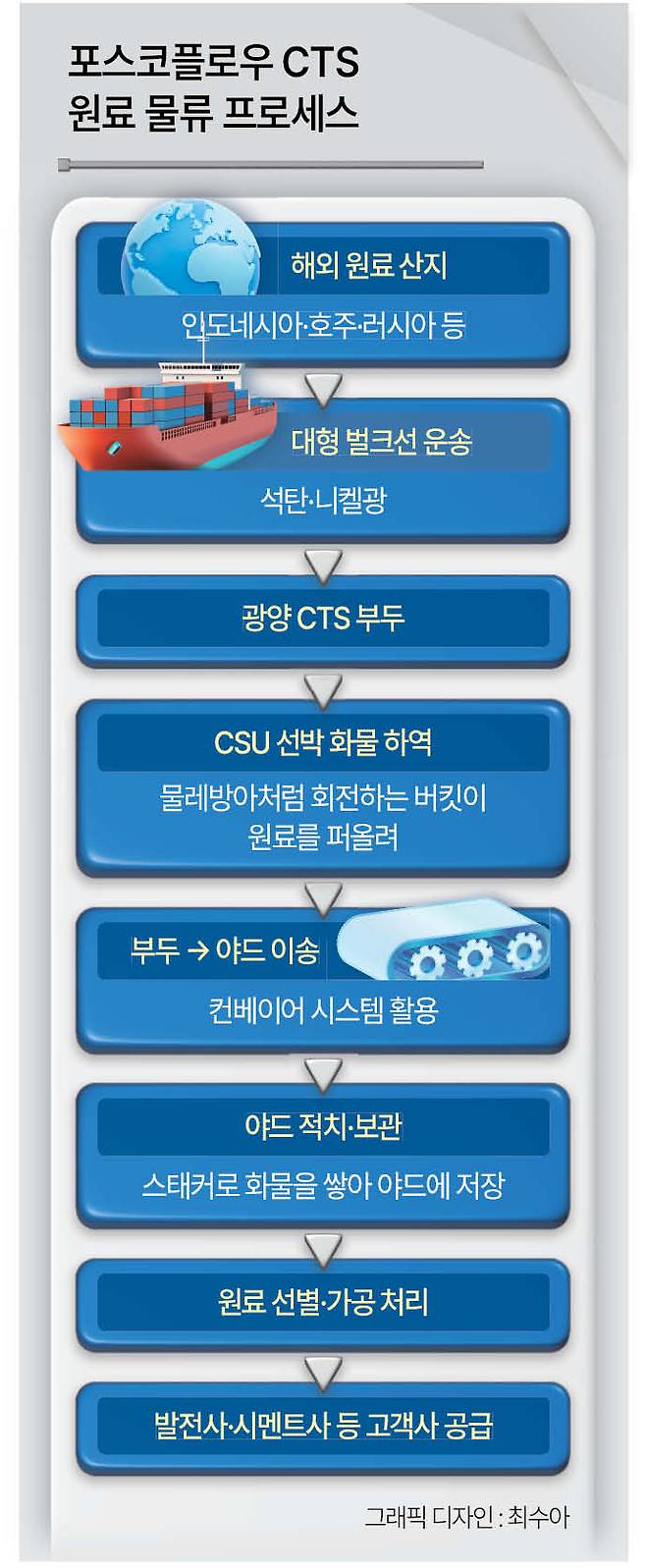 광양 CTS는 해외에서 들여온 석탄과 니켈광을 하역·보관한 뒤 발전소와 산업체로 공급하는 물류 시스템이다. 1980년대 발전소들이 자체 반입·보관 시설 없이 출범하면서 광양제철소의 항만 인프라를 활용해 연료를 안정적으로 공급하기 위해 시작됐다. 현재는 남동발전, SGC에너지, 한화에너지, OCI SE, 일본 시멘트 회사 등으로 공급처가 확대됐다.