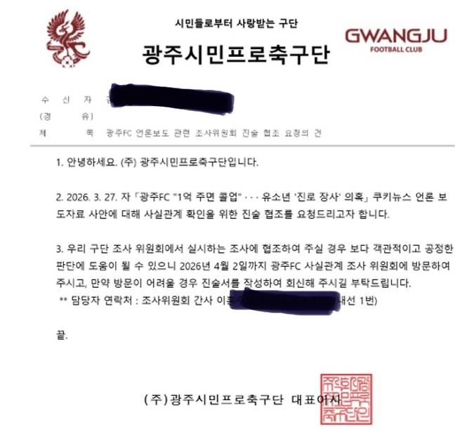 전날(3월 30일) 광주FC는 A씨에게 '사실관계 확인을 위한 진술 협조 요청' 공문을 보내 "우리 구단 조사위원회에서 실시하는 조사에 협조하여 주실 경우 보다 객관적이고 공정한 판단에 도움이 될 수 있으니 4월 2일까지 광주FC 사실관계 조사위원회에 방문하여 주시고, 만약 방문이 어려울 경우 진술서를 작성하여 회신해 달라"라고 요청했다.