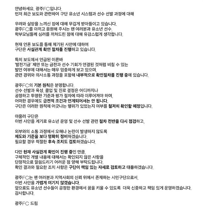 지난 3월 27일 광주FC(광주시민프로축구단, 대표 노동일)가 구단 홈페이지의 '팬 게시판'에 올린 글 중 일부다. 구단이 '우선지명권 철회'에 합의하고 선수 부모로부터 6000만 원을 받았고, 구단의 한 간부가 우선지명권 철회 합의 과정에서 "유소년재단 발전기금으로 1억 원을 기부하면 콜업해주겠다"라고 제안했다는 것이 한국프로축구연맹의 K리그클린센터에 고발된 다음날에 올린 해명이었다. '콜업'이란 유소년 선수를 프로구단 1부리그에 등록해 선수로 기용하는 것으로 사실상 입단 계약에 해당한다.
