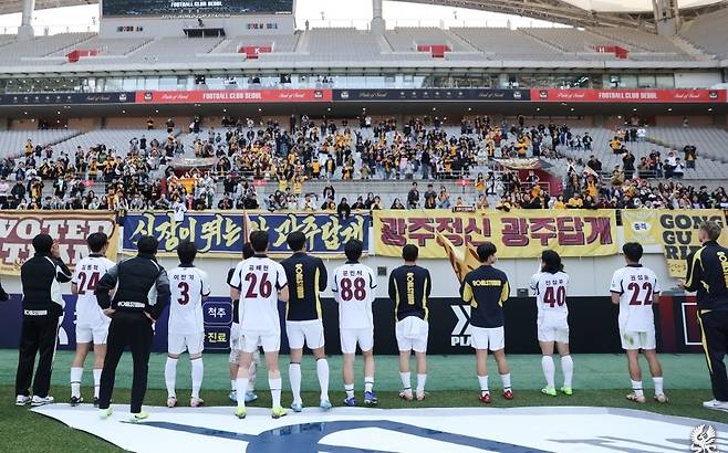 | ▲ 최근 열린 경기에서 광주FC 선수들이 팬들에게 인사하고 있다. |