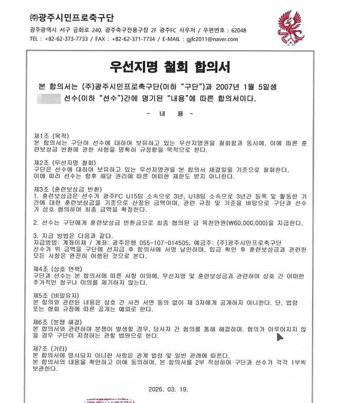 실제로 노동일 광주FC 대표와 선수, A씨가 서명한 '우선지명 철회 합의서'(3월 19일)에는 '비밀유지' 조항(제5조)이 있다. "우선지명 및 훈련보상금과 관련하여 상호간 추가적인 청구나 이의를 제기하지 않는다"라는 제4조에 이어 "본 합의와 관련된 내용은 상호 간 사전 서명 동의없이 제3자에게 공개하지 아니한다"라고 적시된 것이다.