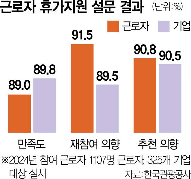참여 근로자들의 만족도도 높다. 응답자의 89.0%가 ‘전반적으로 만족한다’고 답했으며 91.5%가 ‘다시 참여할 의향이 있다’고 했다. 특히 사업 참여자의 연차 소진율은 88.2%로 일반 근로자의 연차 소진율(78.0%)보다 10.2%포인트 더 높았다. 근로자 휴가지원사업 참여가 ‘쉼표 있는 삶’으로 이어진 셈이다. 참여 기업들 역시 89.8%가 ‘만족한다’고 답했고 ‘재참여하겠다’는 응답도 89.5%에 이르렀다.