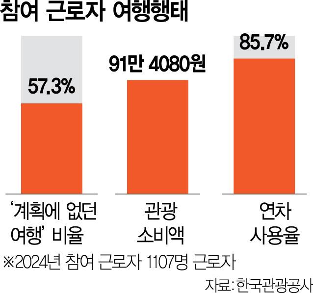 7일 서울경제신문이 입수한 한국관광공사의 ‘근로자 휴가지원사업 성과 분석’ 결과에 따르면 2024년 한 해 동안 해당 사업을 통해 여행을 떠난 근로자들은 평균 91만 4080원을 여행 과정에서 소비했다. 매칭을 통해 마련된 40만 원 외에도 현장에서 50만 원 이상을 추가 소비한 셈이다. 정부 지원금이 10만 원이라는 점을 고려하면 지원금 대비 소비 활성화 효과가 9.14배에 이른다.