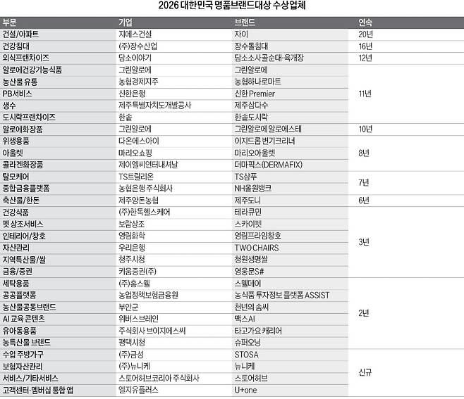 올해는 총 31개 브랜드가 각 분야에서 ‘명품’으로 인정받았다. 건설/아파트 부문 지에스건설 ‘자이’와 건강침대 부문 장수산업 ‘장수돌침대’, 외식프랜차이즈 부문 담소이야기 ‘담소소사골순대·육개장’은 각각 20년, 16년, 12년 연속 대상을 수상했다. 한솥의 ‘한솥도시락’이 도시락프랜차이즈 부문, 신한은행의 ‘신한 Premier’가 PB서비스 부문, 제주삼다수가 생수 부문, 그린알로에가 알로에건강기능식품 부문, 농협하나로마트가 농산물 유통 부문 11년 연속 수상으로 명예의 전당을 지키고 있다. 이외에 뉴니케, 스토어허브, U+one, STOSA 등 다양한 산업군에서 소비자 신뢰를 얻은 브랜드가 올해 처음으로 명품 브랜드 대열에 합류했다.