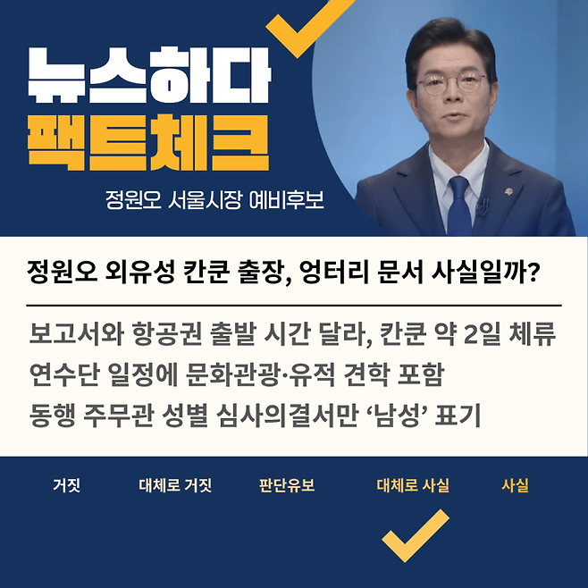 뉴스하다는 정원오 후보의 당시 항공권을 입수해 칸쿤 체류 시간을 추정하고, 현지 일정을 확인해 외유성 여부를 검증했다.