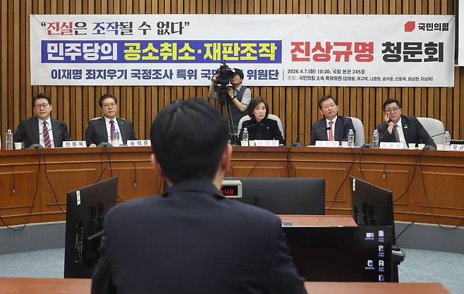 7일 국민의힘이 마련한 '단독 청문회' 행사에 모습을 드러낸 박상용 인천지방검찰청 부부장 검사를 앞에 두고 국민의힘 의원들이 찬사를 쏟아냈다.