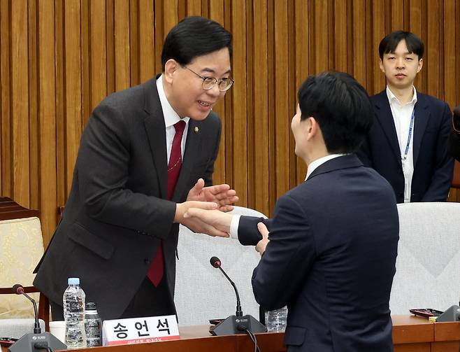 | ▲ 송언석 국민의힘 원내대표가 7일 오전 서울 여의도 국회에서 국민의힘 주최로 '민주당의 공소취소, 재판조작 진상규명 청문회'에 참석해 '쌍방울 대북송금 사건' 수사 과정에서 이화영 전 경기도 평화부지사의 진술 회유 의혹의 당사자인 박상용 전 수원지검 부부장검사와 인사를 나누고 있다. |