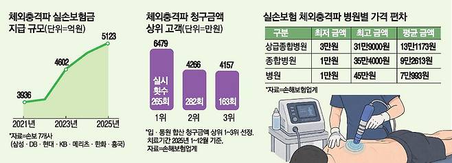 7일 손해보험업계에 따르면 주요 손보사 7곳(삼성화재·DB손해보험·현대해상·KB손해보험·메리츠화재·한화손해보험·흥국화재)에서 지난해 체외충격파 치료와 관련해 지급된 실손보험금은 역대 최대치인 5123억원에 달하는 것으로 집계됐다. 2021년(3936억원) 대비 30.2%나 급증한 수치다. 최근 3년간 손보사들은 실손보험에서 연평균 1조7100억원의 적자를 기록 중이다.