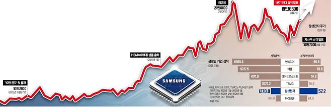 삼성전자가 1분기 기록한 57조2000억원의 영업이익은 세계 대표 기업들 사이에서도 눈에 띄는 성과다. 반도체 부문에서 직접 경쟁하는 대만의 TSMC와 미국 마이크론테크놀로지를 따돌렸고, 애플과 엔비디아, 마이크로소프트 등 글로벌 기업을 바짝 추격했다. 증권가에선 삼성전자 주가가 실적을 기반으로 더 오를 것이란 전망이 확산하고 있다.