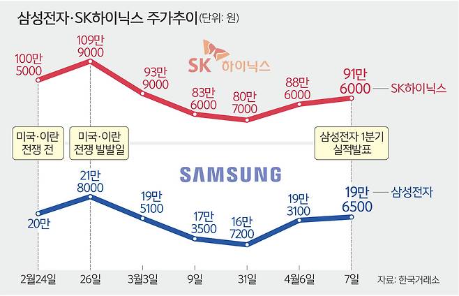 SK하이닉스 실적 기대감이 올라가며 이날 주가는 전일 대비 3.4% 상승한 91만6000원에 마감했다. 증권가의 목표주가도 중동전쟁 등 외부변수와는 상관없는 흐름을 보이고 있다. 주요 증권사(△신한투자증권 150만원 △미래에셋증권 154만원 △하나증권 160만원 △KB증권 170만원)들은 SK하이닉스 목표주가를 150만~170만원 사이로 제시했다.