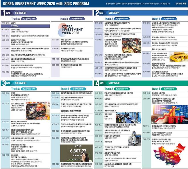 둘째 날인 13일에는 정은보 한국거래소 이사장이 ‘신뢰와 혁신을 통한 코리아 프리미엄 구현’을 주제로 발표한다. 니컬러스 본색 스트래티거스 대표는 이란 전쟁으로 변동성이 커진 가운데 글로벌 시장을 진단한다. 조선 분야에서는 김대영 한화오션 정책협력담당과 정우만 HD현대중공업 함정·중형선기획부문장이 마스가(MASGA) 프로젝트와 한·미 조선 협력에 따른 가능성을, 전력 분야에서는 채대석 LS일렉트릭 대표와 양재철 HD현대일렉트릭 전력사업본부장이 ‘글로벌 전력 인프라 시장 전망과 성장 전략’을 발표한다. 김지평 김앤장 법률사무소 변호사는 기업 지배구조와 관련한 규제 변화와 투자자 유의사항에 관해 설명한다. 로빈 추이 스테이트스트리트인베스트먼트 아시아태평양 부사장은 금 수요 트렌드를 분석하고 시장을 전망한다.