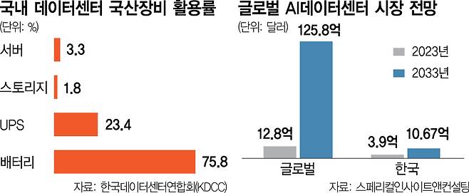 한국의 경우 현재 국내 데이터센터에 들어가는 핵심 장비는 상당 부분 외산에 의존하고 있어 공급망 관련 우려가 크다. 과기정통부에 따르면 2024년 기준 국산 장비 활용 추정치는 서버 3.3%, 스토리지 1.82%, UPS 23.38%, 배터리 75.83% 수준이다. 특히 AI 데이터센터의 핵심 IT 장비인 서버와 스토리지는 여전히 외산 의존이 절대적이다. 이런 구조에서 수입 장비 공급망이 흔들리면 비용 상승은 물론 AI 데이터센터 구축 지연으로도 이어질 수 있다.