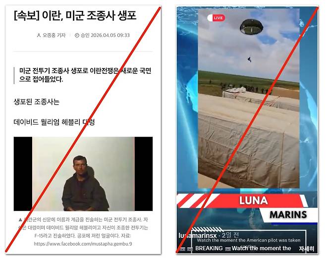| ▲ 지난 4일 이란에서 작전 도중 격추된 미 공군 F-15E 전투기 승무원이 이란 군에 생포돼 신문을 받는 장면과 생포되는 장면 영상이 인터넷에 확산됐지만, 모두 과거 영상을 도용한 가짜뉴스였다. 미국은 지난 5일 두 번째 실종 승무원을 구출했다고 발표했다. |