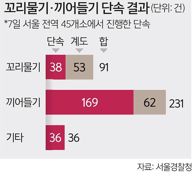 단속은 ‘서울교통 리디자인(Re-디자인)’ 일환으로 실시됐다. 이날 단속에는 서울 전 경찰서에서 교통경찰 195명, 교통기동대 20명, 교통싸이카 8대, 도시고속순찰대 6명 등이 동원됐다. 서울경찰청은 리디자인을 추진하면서 지난해 11월부터 올해 3월까지 꼬리물기·끼어들기 2만3825건을 단속했다. 이는 지난해 같은 기간에 비교해 139.4%(1만3872건) 증가한 수치다.