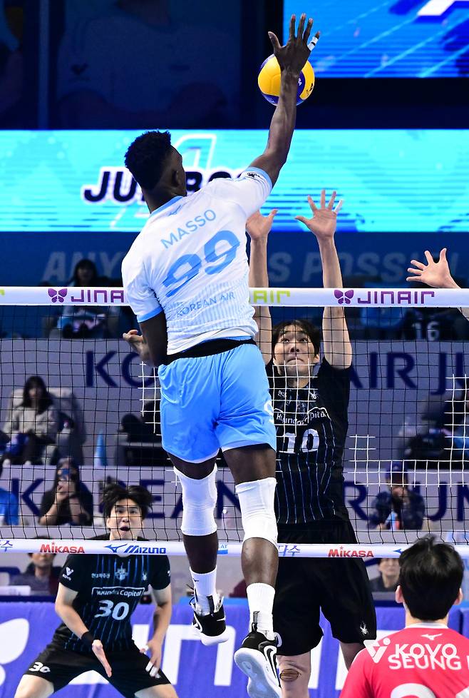 마쏘는 2024~25시즌 독일 리그의 VfB 프리드리히스하펜에서 뛰며 최우수 미들 블로커상을 받았다. 이번 시즌엔 이란 리그의 파이칸에서 아포짓 스파이커로 활약했다. 큰 키(2m4㎝)를 활용한 스파이크 타점과 철벽 블로킹이 강점이다. 대한항공은 토종 공격수 임동혁이 전역 후 마지막 6라운드에서 좋은 모습을 보인 만큼, 마쏘를 미들 블로커로 기용하며 높이와 중앙 공격을 강화한다는 계산이었다.