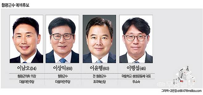 두달여 앞으로 다가온 6·3지방선거에서 함평군수에 도전하는 후보자들 기반 지역도 다르다. 3선 도전에 나선 이상익 후보는 함평읍과 나주 다시면 사이의 학교면 출신이다. 함평군의회 의장인 이남오 후보는 함평읍 지지기반을 바탕으로 민주당 경선에 나섰다. 조국혁신당의 공천장을 받은 전직 군수 이윤행 후보는 영광과 가까운 손불면 출신이다. 농민활동가인 무소속 이행섭 후보는 무안읍 인근 엄다면 출신이다. 고향이 함평읍이 아닌 전·현직 군수가 나오기도 했기 때문에전 지역에서 고른 지지율을 얻는 것이 관건으로 여겨진다.