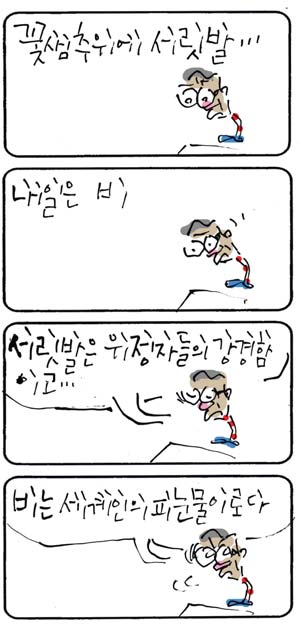 [최경락 꼬투리] 내일은 비 최경락 2026. 4. 7. 20:39 음성으로 듣기 음성재생 설정 이동 통신망에서 음성 재생 시 데이터 요금이 발생할 수 있습니다. 글자 수 10,000자 초과 시 일부만 음성으로 제공합니다. 남성 여성 느림 보통 빠름 음성 재생하기 닫기 음성 재생 중지 번역 설정 번역beta Translated by kaka i 한국어 - English 영어 日本語 일본어 简体中文 중국어 Nederlands 네델란드어 Deutsch 독일어 Русский 러시아어 Malaysia 말레이시아어 বাঙ্গোল ভাষা 벵골어 tiếng Việt 베트남어 Español 스페인어 اللغة العربية 아랍어 Italiano 이탈리아어 bahasa Indonesia 인도네시아어 ภาษาไทย 태국어 Türkçe 튀르키에어 Português 포르투갈어 Français 프랑스어 हिन्दी 힌디어 닫기 번역중 Now in translation 글씨크기 조절하기 글자크기 설정 파란원을 좌우로 움직이시면 글자크기가 변경 됩니다. 가 매우 작은 폰트 작은 폰트 보통 폰트 큰 폰트 매우 큰 폰트 가 이 글자크기로 변경됩니다. (예시) 가장 빠른 뉴스가 있고 다양한 정보, 쌍방향 소통이 숨쉬는 다음뉴스를 만나보세요. 다음뉴스는 국내외 주요이슈와 실시간 속보, 문화생활 및 다양한 분야의 뉴스를 입체적으로 전달하고 있습니다. 닫기 인쇄하기 Copyright © 저작권자 © 중부일보 - 무단전재 및 재배포 금지