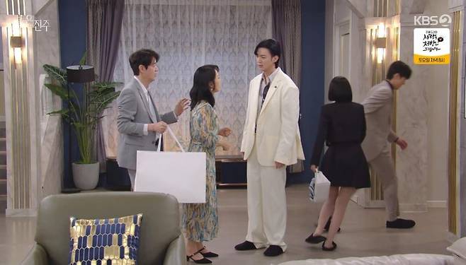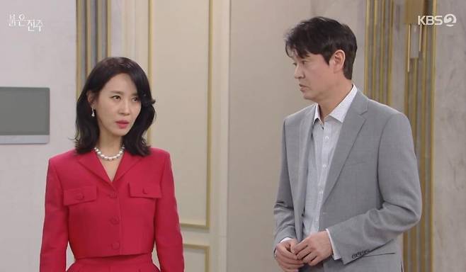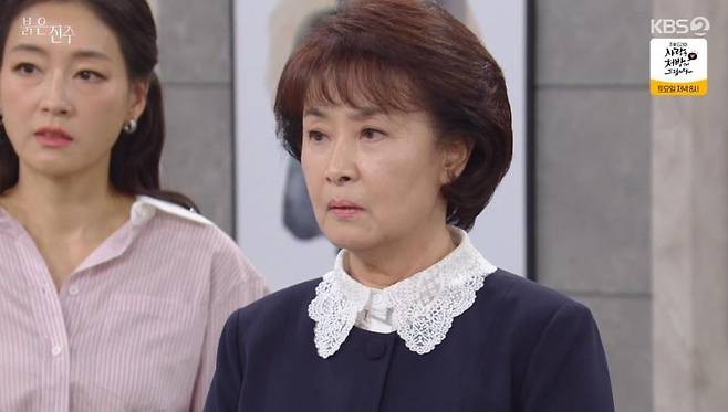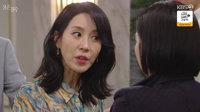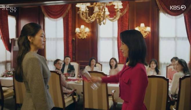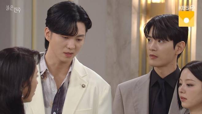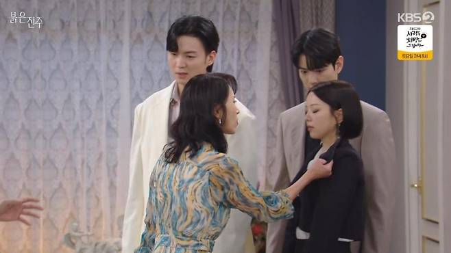 7일 방송된 KBS 2TV 일일드라마 '붉은 진주'에서는 오정란(김희정 분)이 공개 석상에서 김단희(박진희 분)에게 와인을 뿌리고 폭행을 저지르는 한편, 클로이(남상지 분)를 둘러싼 박민준(김경보 분)과 박현준(강다빈 분) 형제의 감정 대립이 수면 위로 떠오르며 극의 갈등 구조가 한층 복잡해졌다.